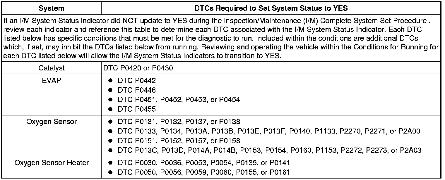 Inspection/Maintenance (I/M) System DTC Table