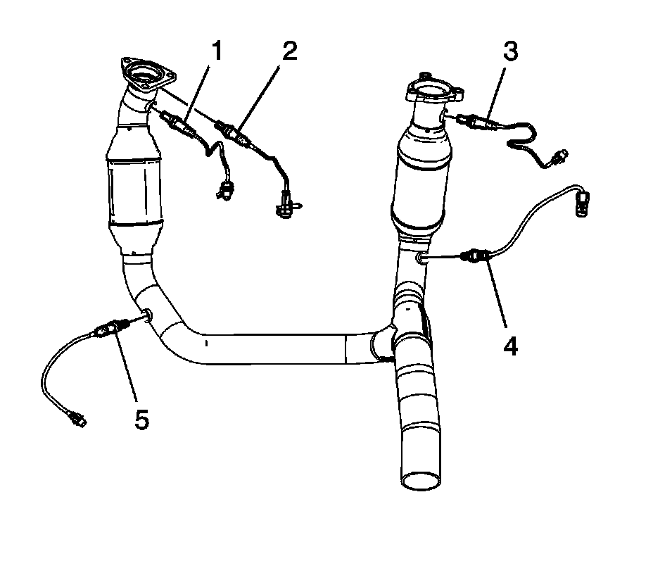 6. If replacing the three way catalytic converter Install the heated oxygen (HO2S) sensors (1 - 5) otherwise Connect the heated oxygen (HO2S) sensors harness connectors. Refer to Heated Oxygen Sensor Replacement - Bank 1 Sensor 1 (Heated Oxygen Sensor Replacement - Bank 1 Sensor 1) , Heated Oxygen Sensor Replacement - Bank 1 Sensor 2 (Heated Oxygen Sensor Replacement - Bank 1 Sensor 2) , Heated Oxygen Sensor Replacement - Bank 2 Sensor 1 (Heated Oxygen Sensor Replacement - Bank 2 Sensor 1) and Heated Oxygen Sensor Replacement - Bank 2 Sensor 2 (Heated Oxygen Sensor Replacement - Bank 2 Sensor 2).