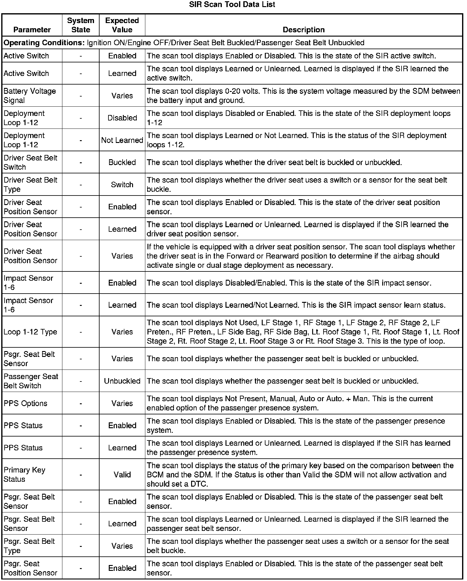 Use the SIR scan tool data list as directed by a diagnostic table or in order to supplement the diagnostic procedures. Begin all of the diagnostic procedures with the Diagnostic System Check - Vehicle (Diagnostic System Check - Vehicle). Use the Scan Tool Data Lists after the following is determined: