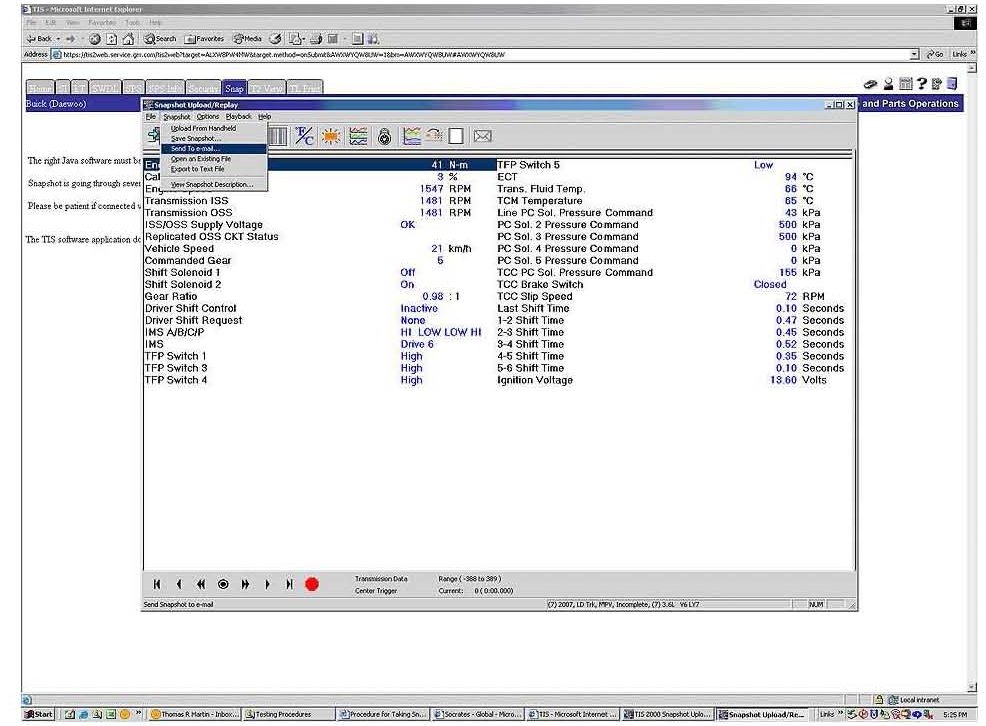 4. Once communication is established and you select the file you want to upload, you will see a screen similar to below. You can email the file directly from TIS2WEB by going to the Snapshot drop down menu and selecting "Send to e-mail" as shown in Figure 11.