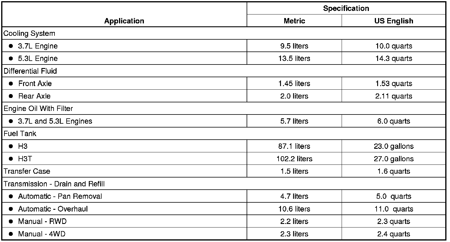 Home >> Hummer >> 2010 >> H3 L5-3.7L >> Repair and Diagnosis >> Maintenance >> Specifications