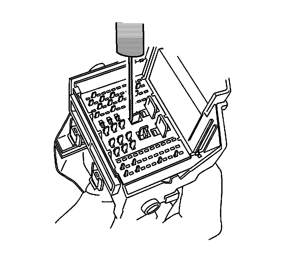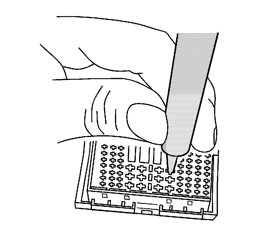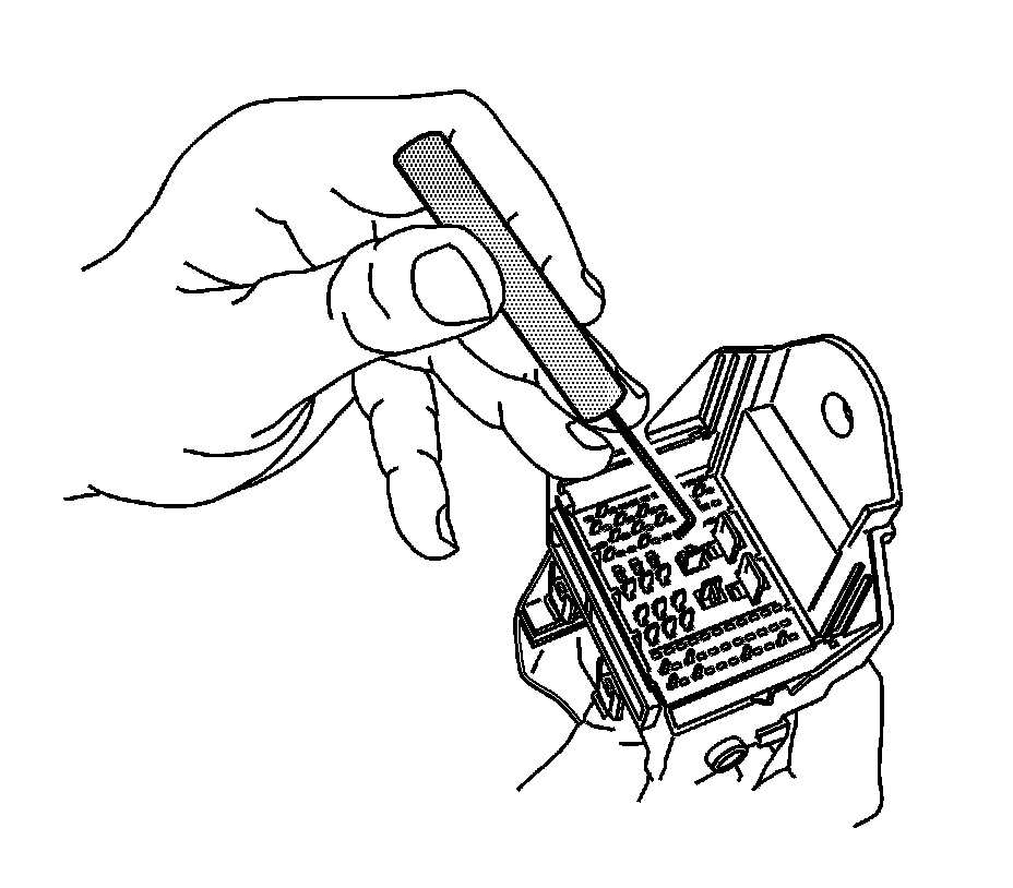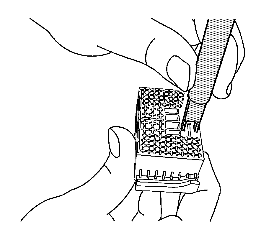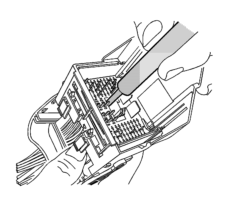 14. Using terminal release tool J 38125-221, press the prongs into the holes on each side of the terminal to be removed to release the lock tabs and pull the terminal out of the connector body.