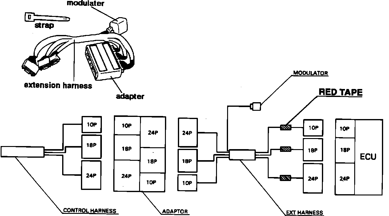 Installation of extension harness, end with RED TAPE goes to ECU.
