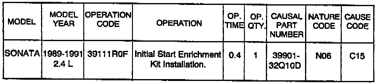 1989-1991 model year Sonatas with 2.4 L engines and automatic transaxle may stall when the ambient air temperature is 50-70° F and the transaxle is shifted into gear immediately after starting a cold engine. A Field Fix kit has been designed to correct this condition. This kit does not affect engine performance at any other time. If a customer has an initial start related complaint, the following steps should be taken: