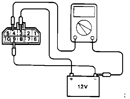 3. Connect a 12V power supply (+) terminal to the terminal 3 of the multipoint fuel injection control relay and measure the voltages at the terminal 4 when the (-) terminal is connected to and disconnected from the terminal 9.