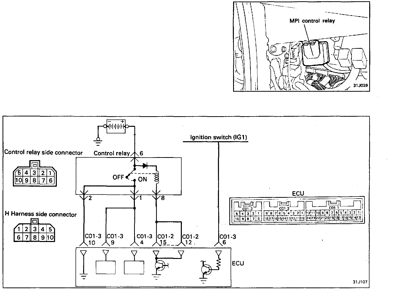 When the ignition switch is turned on, battery voltage is applied from the ignition switch to the ECU. This is turns ON the power transistor and energizes the control relay coil. This turns ON the control relay switch and power is supplied from the battery to the ECU through the control relay switch.