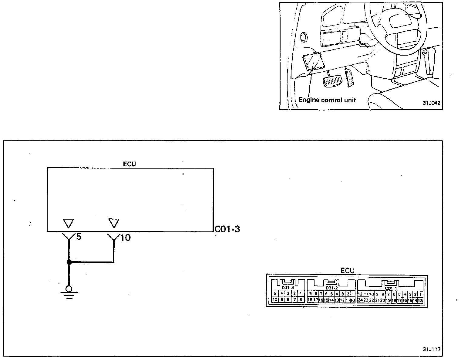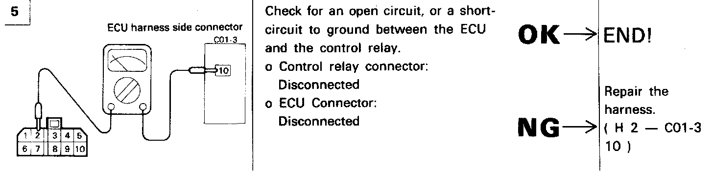 2. Using an ohm meter, check for continuity between ECU harness terminal 5 and ground.
