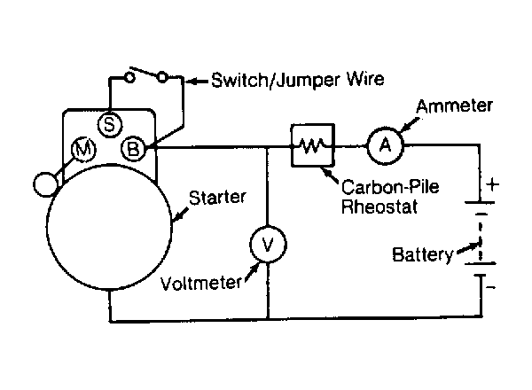 2. Install voltmeter across starter motor. See Fig 1. Adjust carbon pile rheostat until voltmeter reads test voltage. See STARTER NO-LOAD SPECIFICATIONS  table. Install jumper wire across solenoid terminals "B" and "S" (maximum 10 seconds).