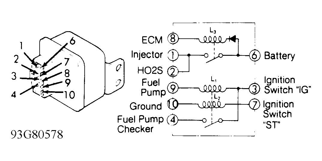 - Apply battery voltage across terminals No. 7 (positive) and No. 10 (negative) while checking continuity between terminals No. 3 and 4. Replace relay if continuity does not exist.