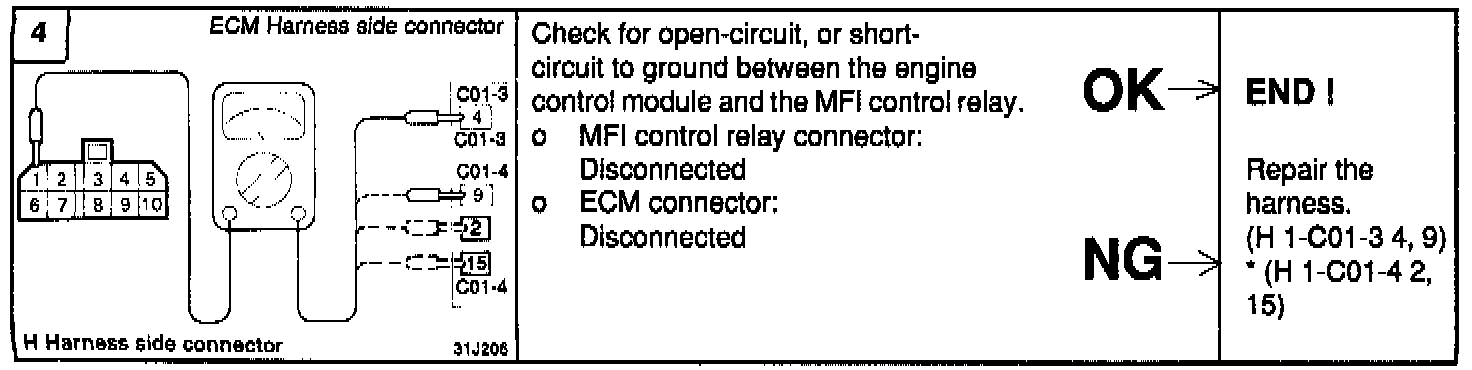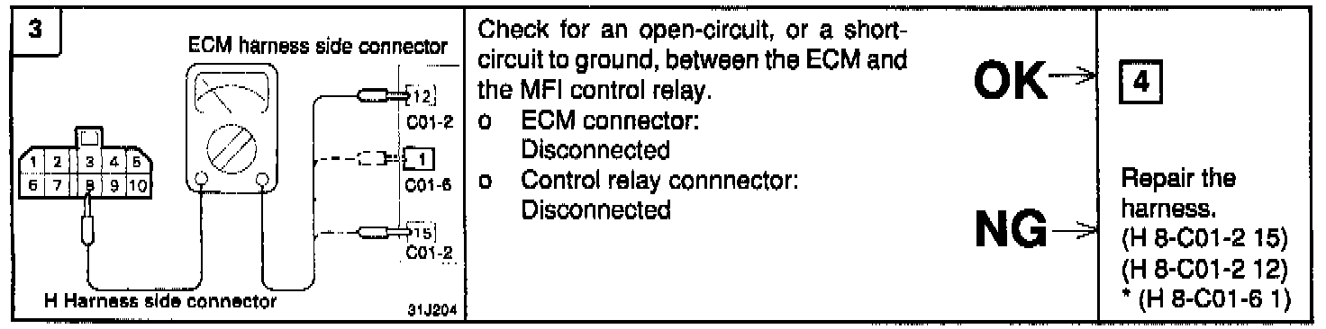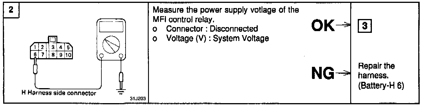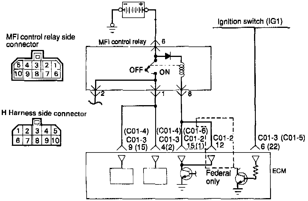 1. Connect a 12V power supply (+) terminal to the terminal 6 of the MFI control relay and measure the voltages at terminal 1 when the (-) terminal is connected to and disconnected from the terminal 8.
