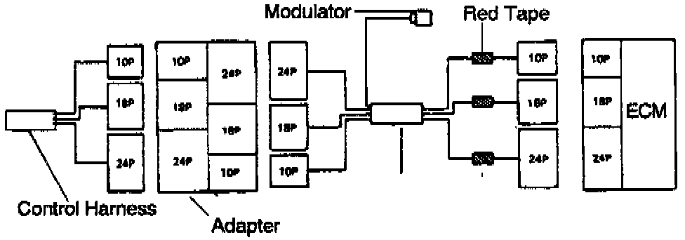 9. Connect the extension harness connectors (red-taped side) to the ECM and the control harness connectors to the adapter of the repair kit.