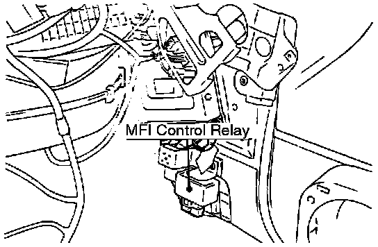 The control relay supplies positive current to purge solenoid, air flow sensor, engine control module, and injectors. When the ignition switch is turned on, battery voltage is applied from the ignition switch to the engine control module. This is turns ON the ignition power transistor and energizes the multipoint fuel injection control relay coil. This turns ON the multipoint fuel injection control relay switch and power is supplied from the battery to the engine control module through the multipoint fuel injection control relay switch.