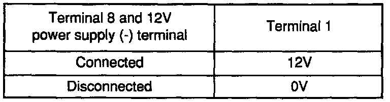 1. Connect a 12V power supply (+) terminal to the terminal 6 of the multipoint fuel injection control relay and measure the voltages at terminals 2 and 1 when the (-) terminal is connected to and disconnected from the terminal 8.