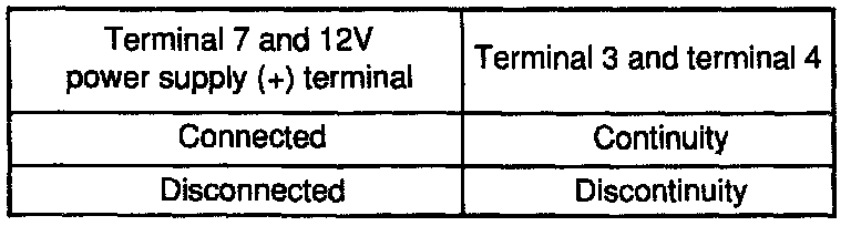 2. Connect a 12V power supply (-) terminal to the terminal 10 of the multipoint fuel injection control relay and check the continuity between terminals 3 and 4 when the (+) terminal is connected to and disconnected from the terminal 7.