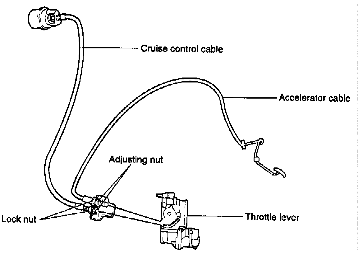 5. Keeping throttle lever in contact with cruise control lever, tighten adjusting nut of accelerator cable to lessen its play. Inner cable play should be 0.04-0.08 inch.