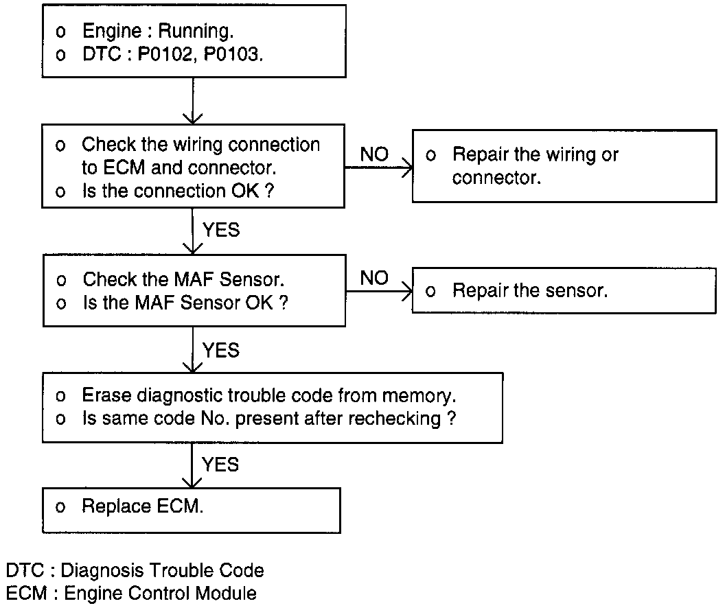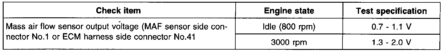 2. If the MAF sensor output voltage is other than 0 when the ignition switch is turned on (do not start the engine). Check for the faulty MAF sensor or ECM.