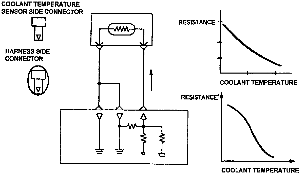 The engine coolant temperature sensor is located in the coolant passage of the cylinder head. It detects engine coolant temperature and sends signals to the powertrain control module (PCM). The engine coolant temperature sensor uses a thermistor which is sensitive to changes in temperature. The electric resistance of a thermistor decreases in response to a rise in temperature. Thus, when the temperature increases, the output voltage decreases The PCM determines engine coolant temperature by the sensor output voltage and provides optimum fuel enrichment when the engine is cold.