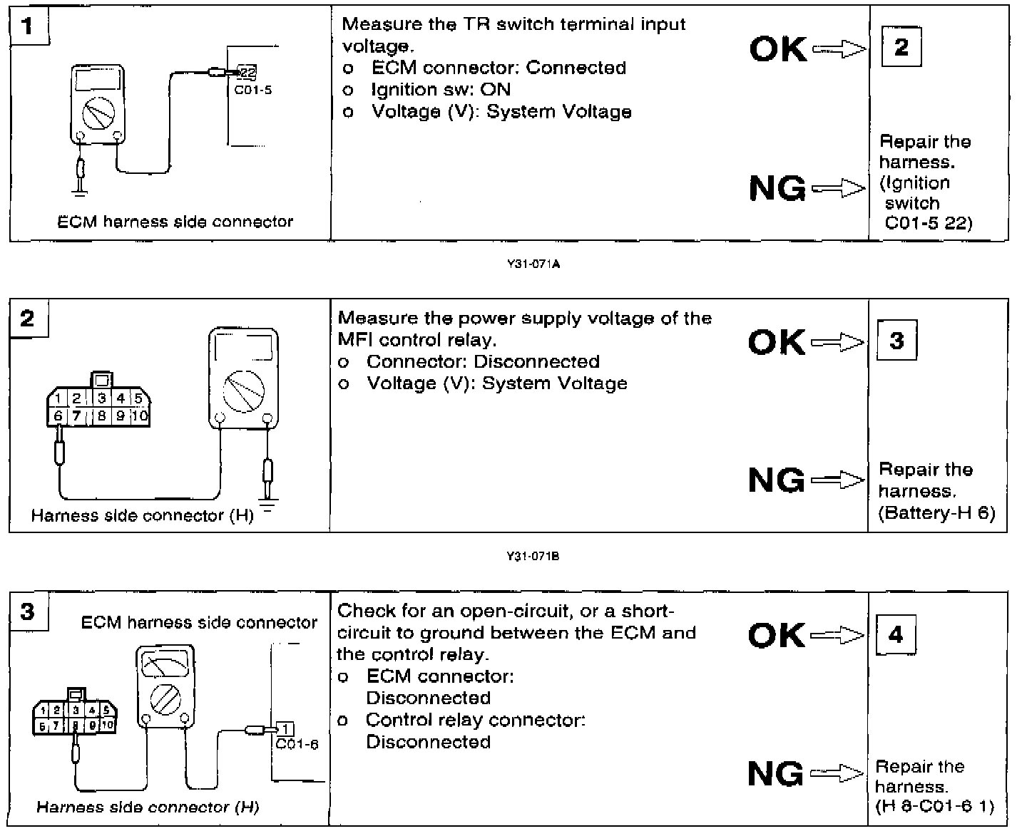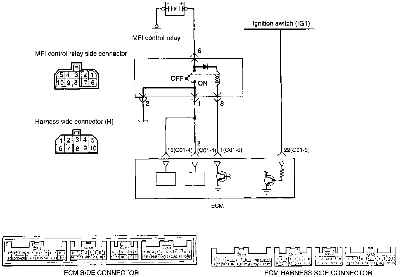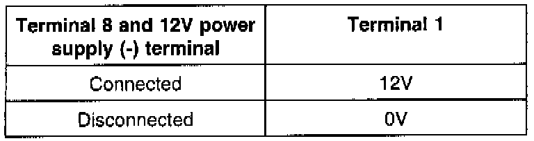 1. Connect a 12 Volt power supply (+) terminal to terminal 6 of the MFI control relay and measure the voltages at terminal 1 when the (-) terminal is connected to and disconnected from the terminal 8.