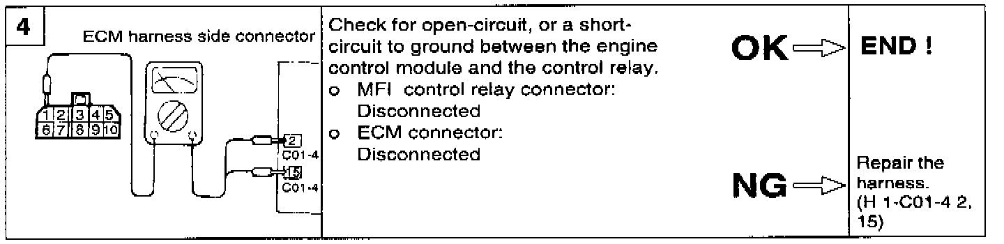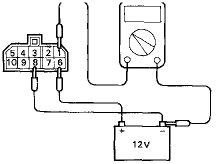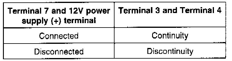 2. Connect a 12 Volt power supply (-) terminal to terminal 10 of the MFI control relay and check the continuity between terminals 3 and 4 when the (+) terminal is connected to and disconnected from the terminal 7.