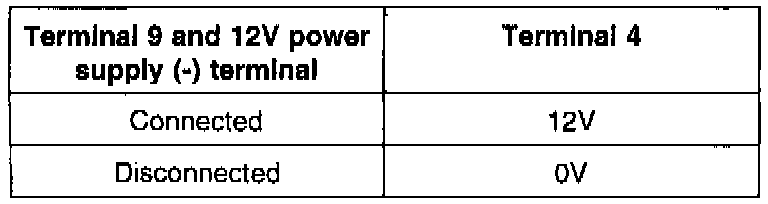 3. Connect a 12 Volt power supply (+) terminal to terminal 3 of the MFI control relay. Measure the voltages at terminal 4 when the (-) terminal is connected to and disconnected from the terminal 9.