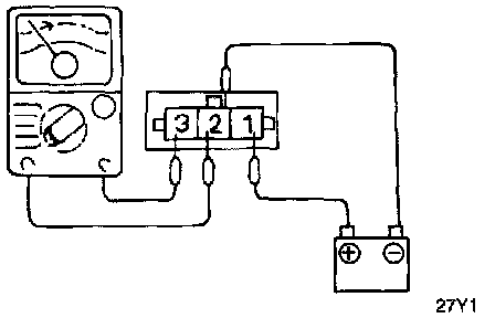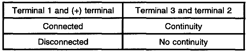 1. Connect the negative (-) terminal of a 3 Volt power supply to terminal 2 of the power transistor; then check whether there is continuity between terminal 3 and terminal 2 when terminal 1 and the positive (+) terminal are connected and disconnected.