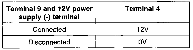 3. Connect a 12V power supply (+) terminal to terminal 3 of the MFI control relay. Measure the voltages at terminal 4 when the (-) terminal is connected to and disconnected from the terminal 9.