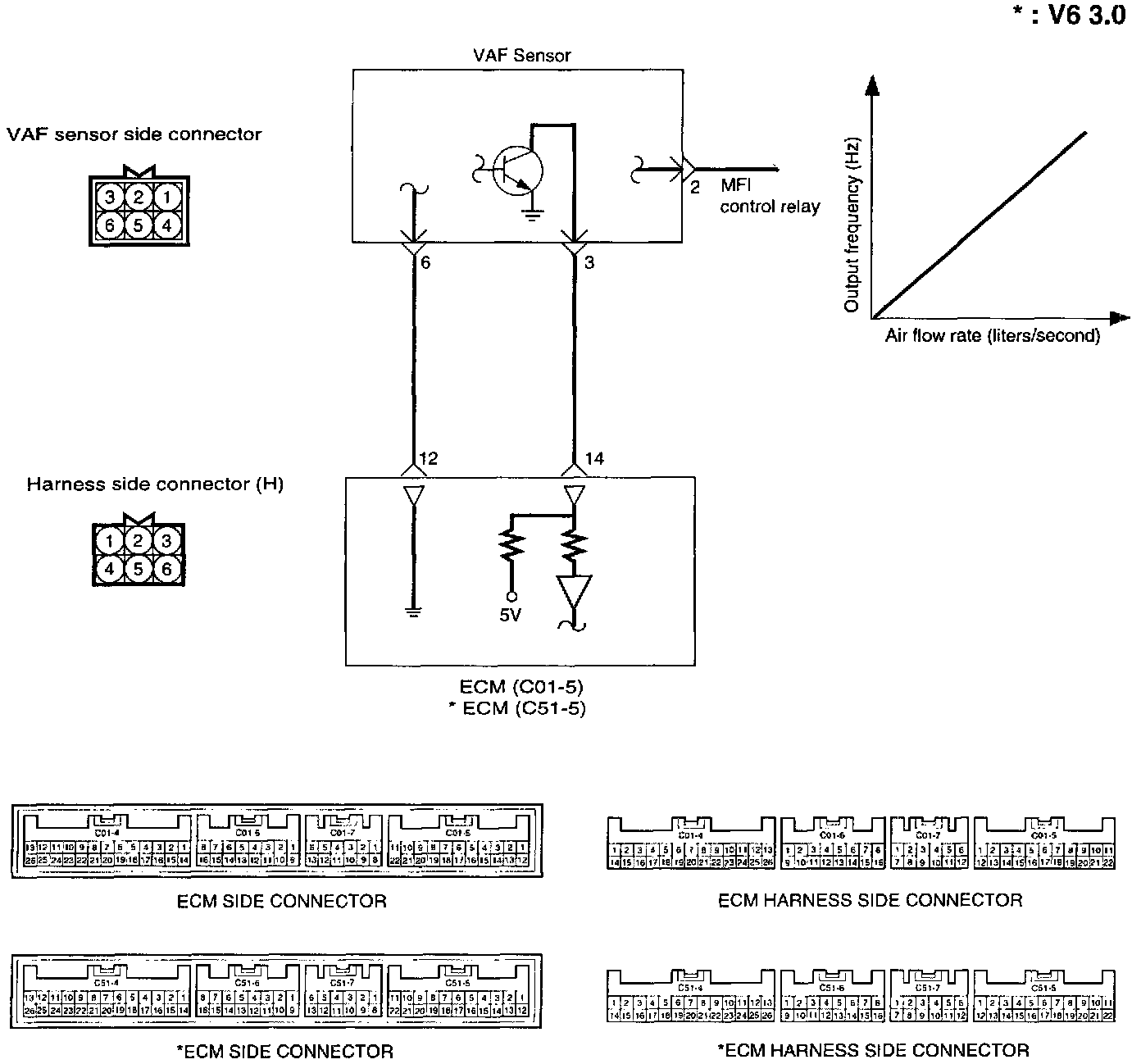 2. If the VAF Sensor output frequency is other than 0 when the ignition switch is turned on (do not start the engine), check for the faulty VAF Sensor of ECM.