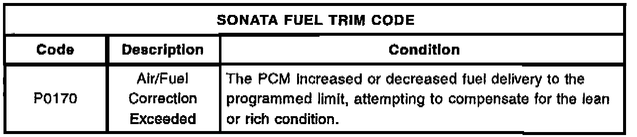 ^ The Sonata engine management system will only set one Fuel Trim code. Code P0170 will set when the "Long Term" Fuel Trim values are "Rich" or "Lean" beyond the programmed limits.