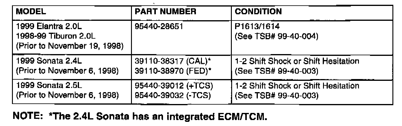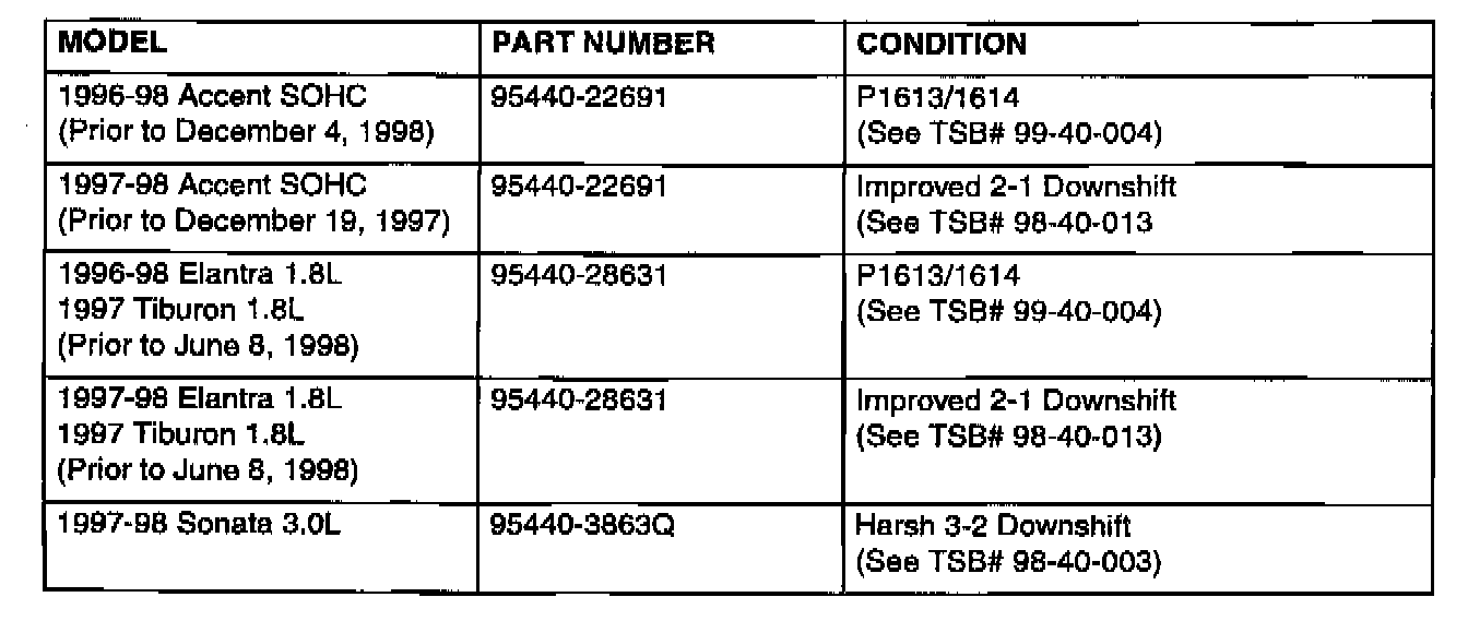 Home >> Hyundai >> 1999 >> Sonata GL L4-2.4L >> Repair and Diagnosis >> Powertrain Management >> Transmission Control Systems >> Relays and Modules - Transmission and Drivetrain >> Relays and Modules - A/T >> Control Module >> Technical Service Bulletins >> All Technical Service Bulletins >> A/T - Transmission Control Modules Modified