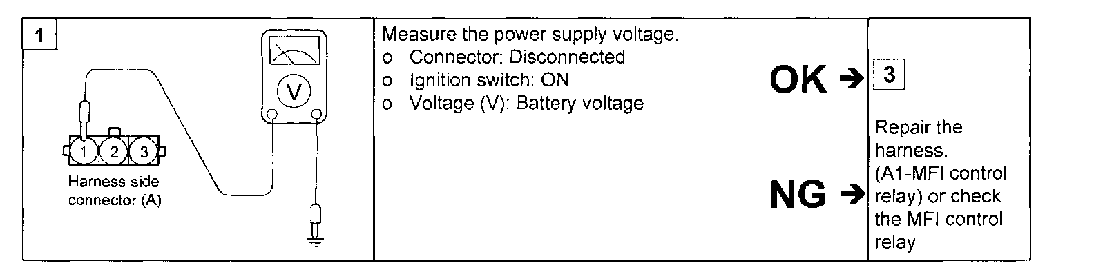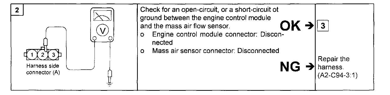 2. If the MAF sensor output voltage is other than 0 when the ignition switch is turned on (do not start the engine). Check for the faulty MAF sensor or ECM.