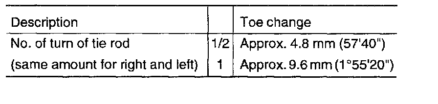 1) Toe-in adjustment should be made by turning the right and left tie rods the same amount.