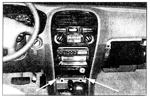 14) Remove the two screws that hold the passenger side lower center console trim in place. Slide loose the plastic clip at the front of the trim panel and remove the panel. Repeat on the driver's side.