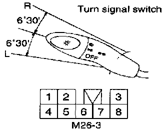 With the multifunction switch in each position, make sure that continuity exists between terminals below. If continuity is not as specified, replace the multifunction switch.Lighting switch (Connector No.: M26-3)