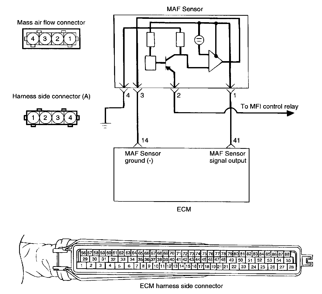 1. If the engine stalls occasionally, start the engine and shake the MAF sensor harness. If the engine stalls, check for poor contact at the MAF sensor connector.
