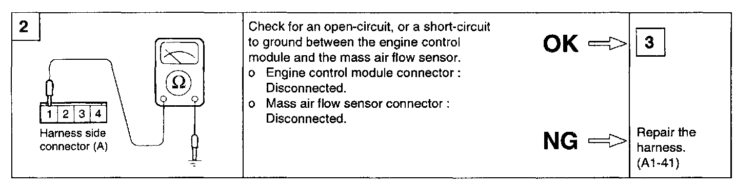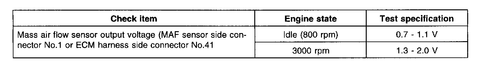 2. If the MAF sensor output voltage is other than 0 when the ignition switch is turned on (do not start the engine). Check for the faulty MAF sensor or ECM.