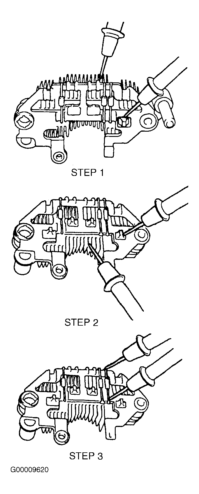 Using ohmmeter, check continuity between each negative diode and stator coil lead terminal, in both directions. See STEP 2 in illustration. See Figure-Figure . Continuity should exist in only one direction. If continuity of any negative diode is not as specified, replace rectifier assembly.