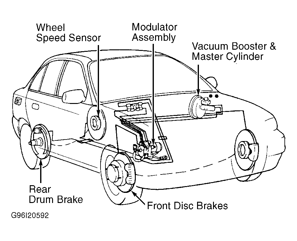 ABS system consists of wheel speed sensors, sensor rotors (tone wheels), ABS warning light, ABS ECM, ABS modulator and modulator sub-assemblies. See Fig 1.