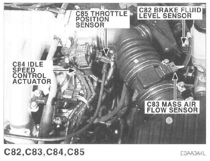 C82 Brake Fluid Level Sensor, C83 Mass Air Flow Sensor, C84 Idle Speed Control Actuator, C85 Throttle Position Sensor: