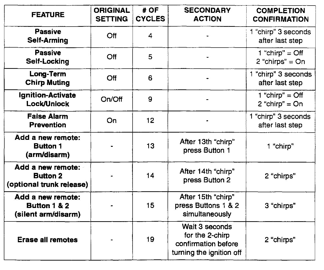 ^ # Of Cycles: The number of "Valet Switch Cycles" (on/off) required to accomplish programming change. Each complete cycle will be followed by a siren "chirp" or a horn "beep".