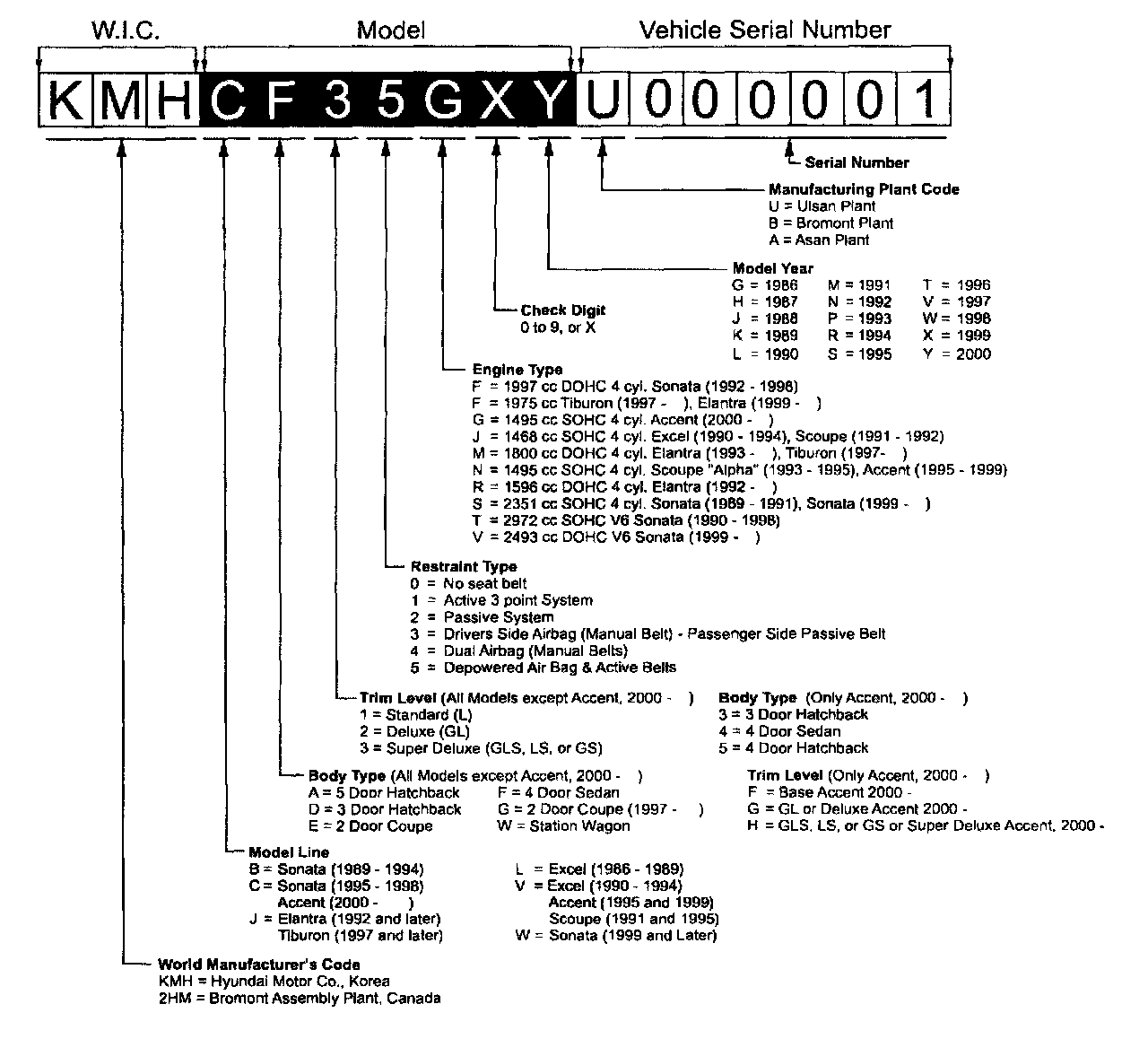 Hyundai is redefining two positions in the VIN Code sequence beginning with the Model Year 2000 Accent. Definitions for the fifth and sixth digit of the VIN Code will be reversed. At present this change only affects the 2000 Model Year Accent. The new VIN Code sequence pattern will be applied to all redesigned models in the future.