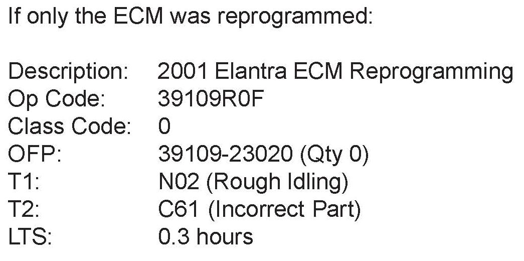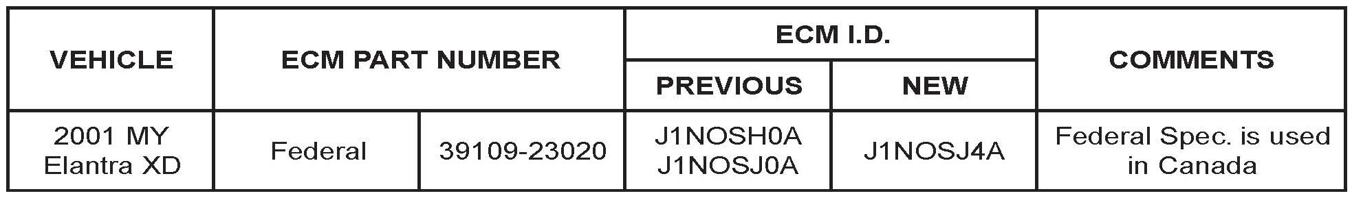 If you encounter a 2001 MY Elantra XD (as specified below) that has either, or both, of these symptoms, follow the procedure in the "Diagnosis/Repair" section, below, before proceeding to the "ECM Reprogramming" procedure.