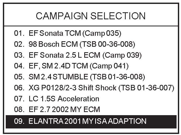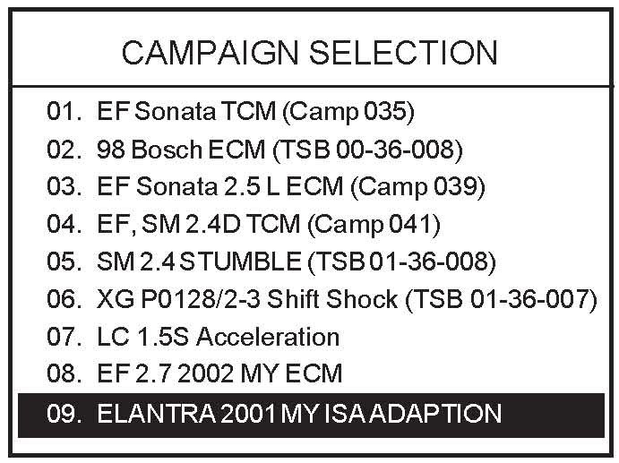 4. Select option '09. "ELANTRA 2001 MY ISA ADAPTION" and press "ENTER"
