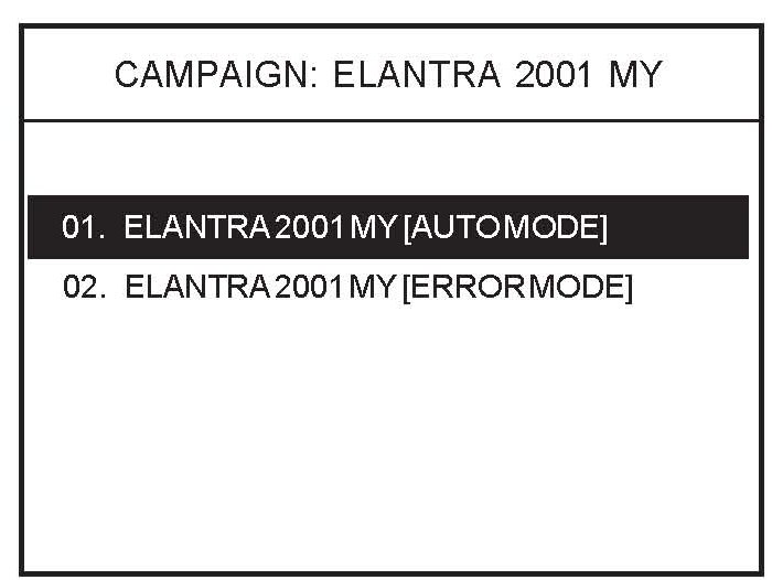 5. Select option "01. ELANTRA 2001 MY [AUTO MODE]" and press "ENTER."