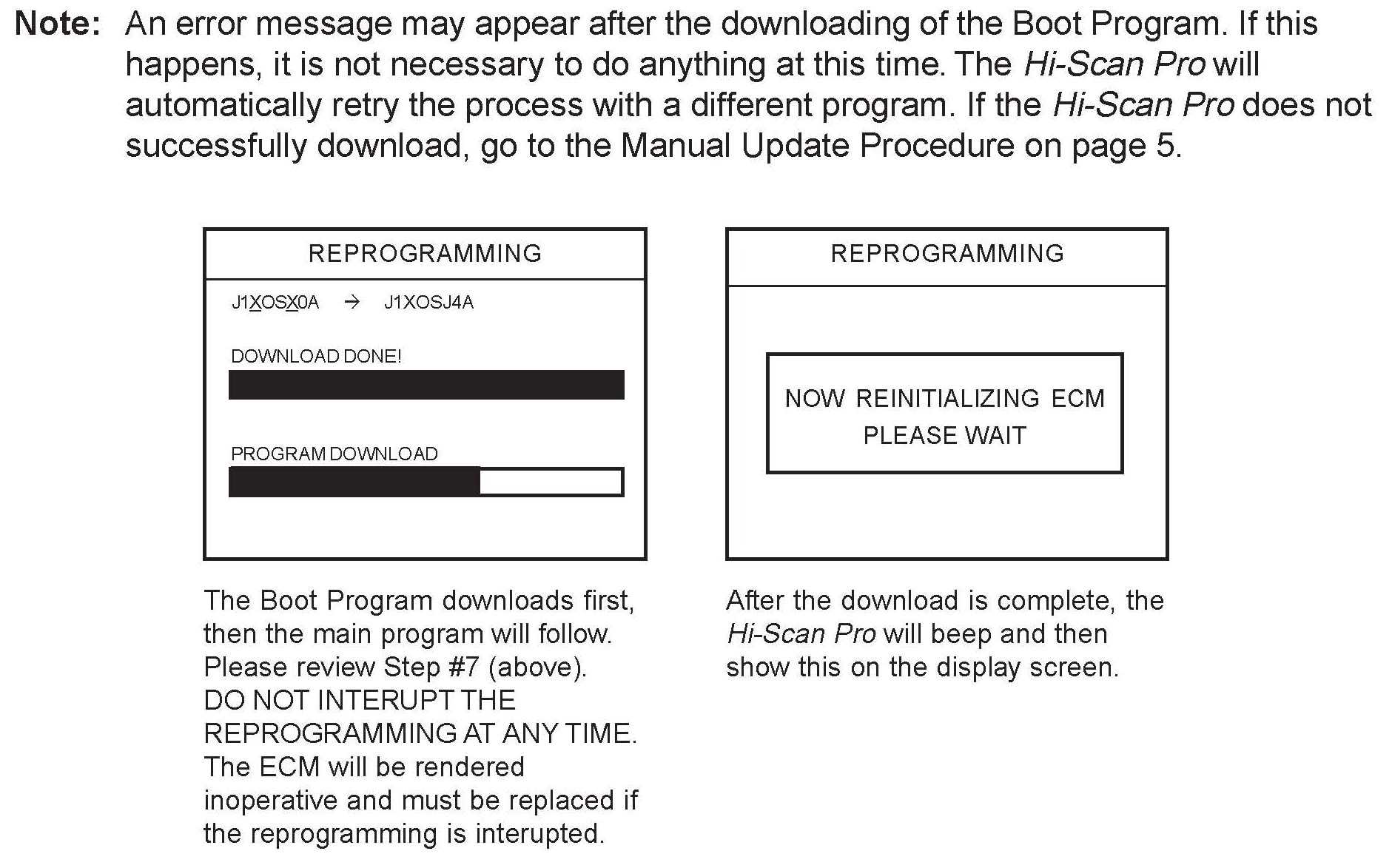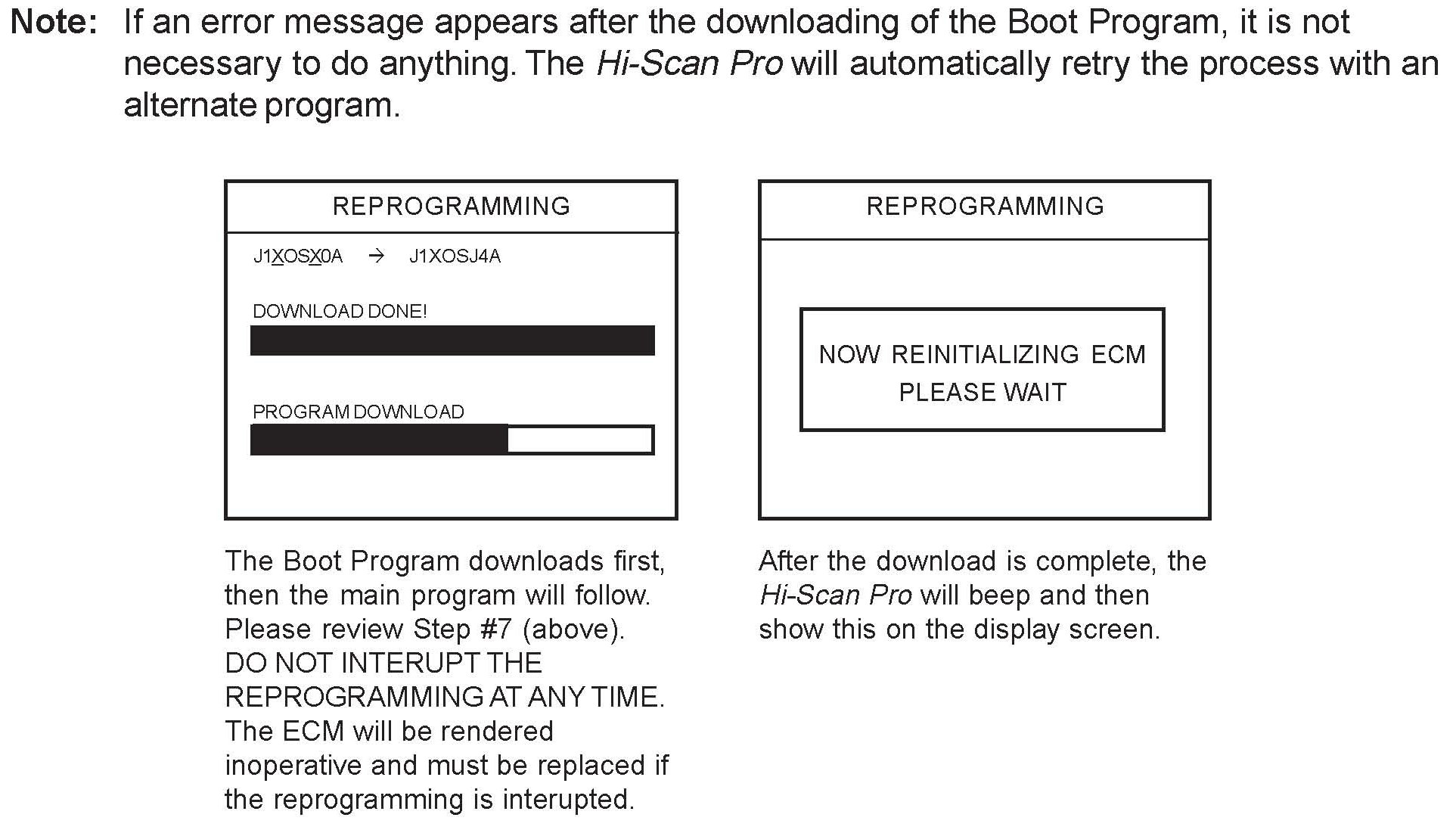 2. REPROGRAMMING ERROR PLEASE WAIT FOR RETRY: An error occurred during reprogramming. The Hi-Scan Pro will retry reprogramming automatically.