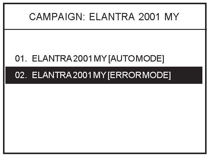 5. Select option "02. "ELANTRA 2001 MY [ERROR MODE]" and press "ENTER"