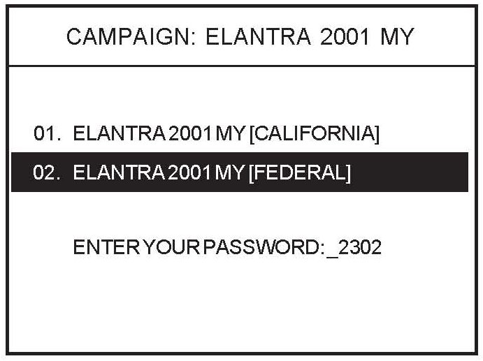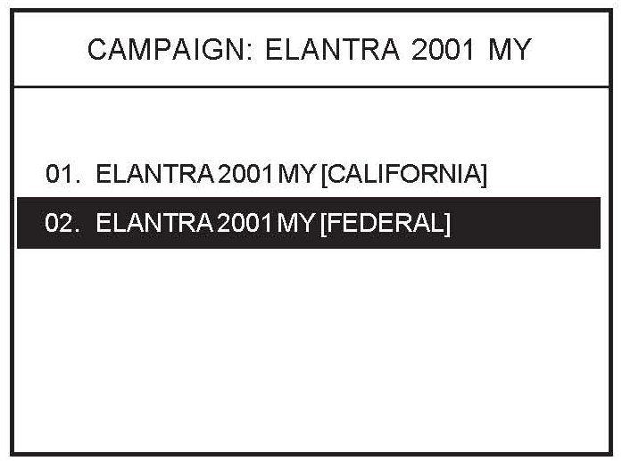 6. Select option "02. "ELANTRA 2001 MY (FEDERAL)" and press "ENTER".