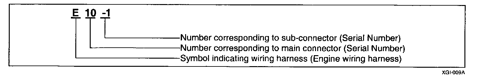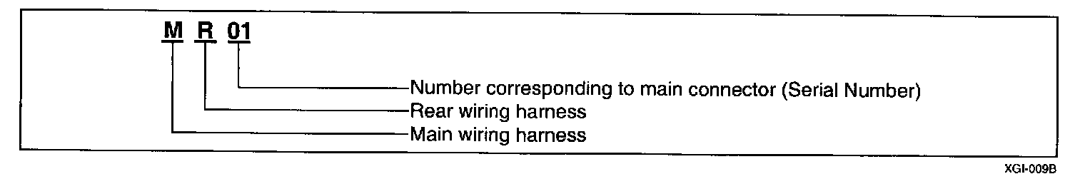 A connector identification symbol consists of a wiring harness location classification symbol corresponding to a wiring harness location and number corresponding to the connector. These connector locations can be found in the HARNESS LAYOUTS.For example: