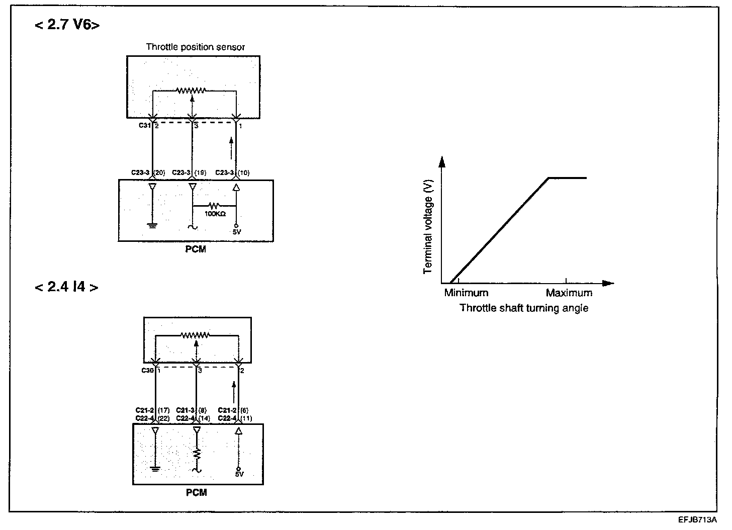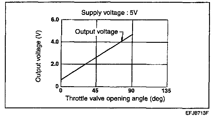 The TPS is a variable resistor type that rotates with the throttle shaft to sense the throttle valve angle. As the throttle shaft rotates, the output voltage of the TPS changes. The PCM detects the throttle valve opening based on this voltage change.