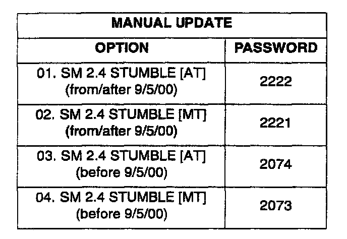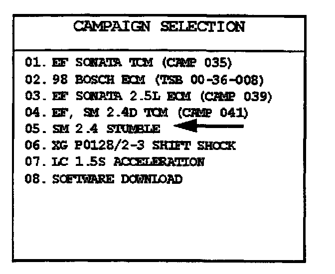 NOTE:In the event that "01. SM 2.4 IDLE STUMBLE (AUTO)" fails to download the new ECM and TCM programs, option "02. SM 2.4 STUMBLE (ERROR)" must be used.