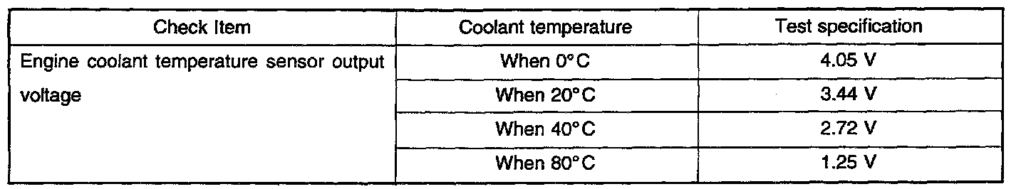 The engine coolant temperature sensor is installed in the engine coolant passage of the cylinder head, detects engine coolant temperature and emits signals to the ECM. This part employs a thermistor which is sensitive to changes in temperature. The electric resistance of a thermistor decreases in response to temperature rise. The ECM judges engine coolant temperature by the sensor output voltage and provides optimum fuel enrichment when the engine is cold.